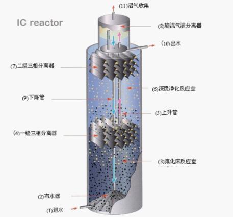 IC(internalcirculation)反应器是新一代高效厌氧反应器,废水在反应器中自下而上流动,污染物被细菌吸附并降解,净化过的水从反应器上部流出。是20世纪80年代中期荷兰PAQUES在UASB反应器的基础上成功开发的第三代高效厌氧生物反应器。